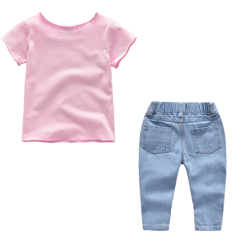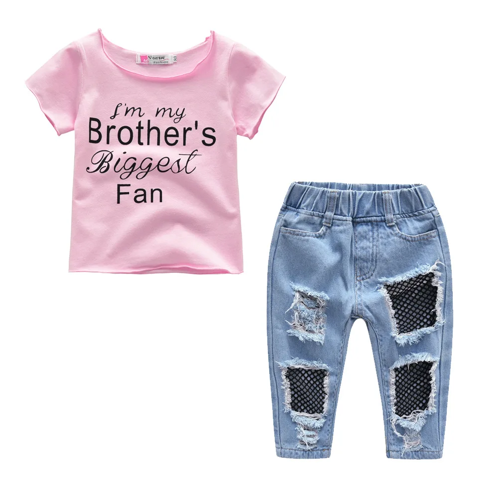 Cheap Chance for SexeMara Kids Baby Girls Clothing Set T shirt Tops Cotton Short Sleeve Mesh Jeans Stretch Pants 2pc
